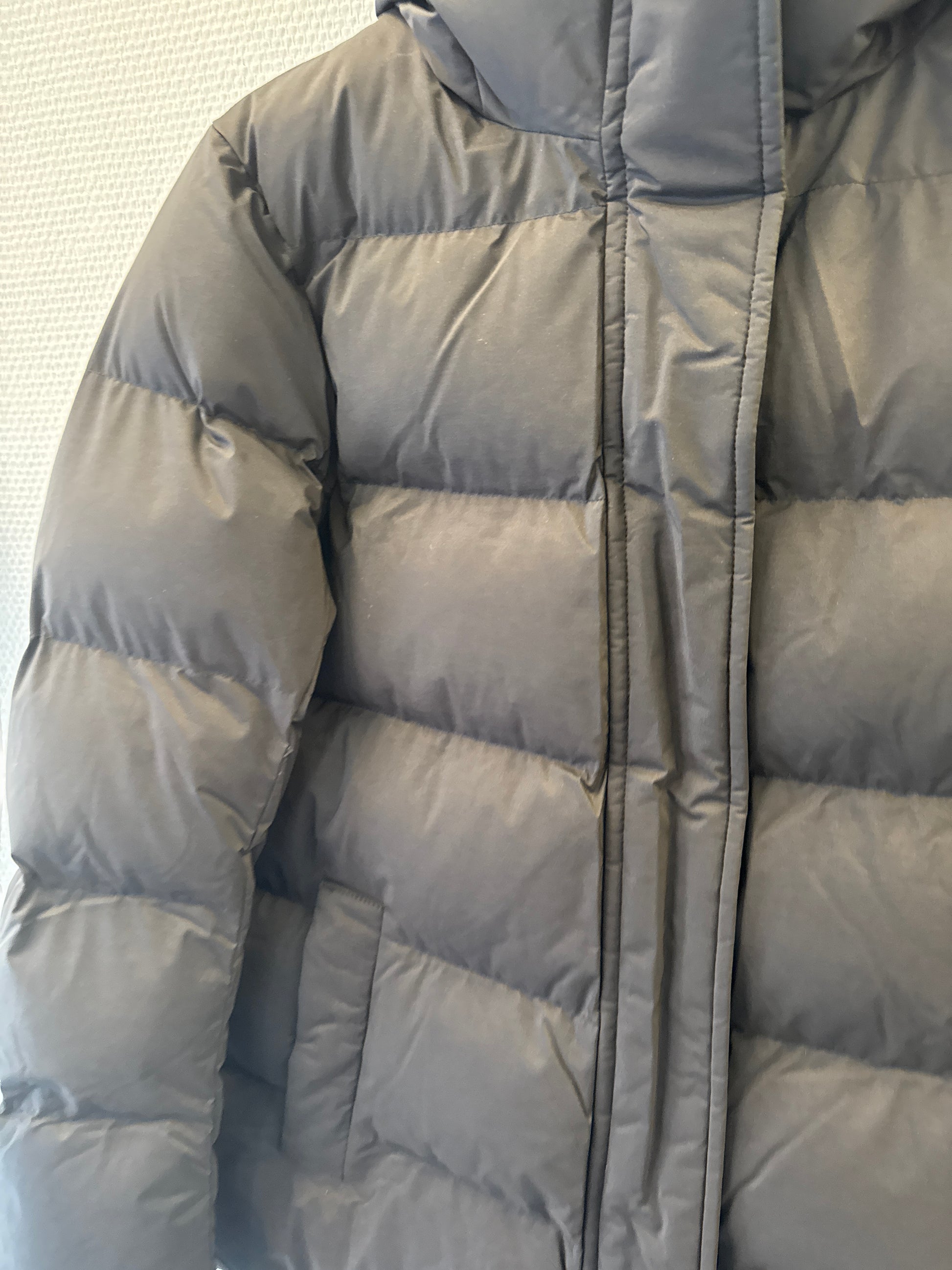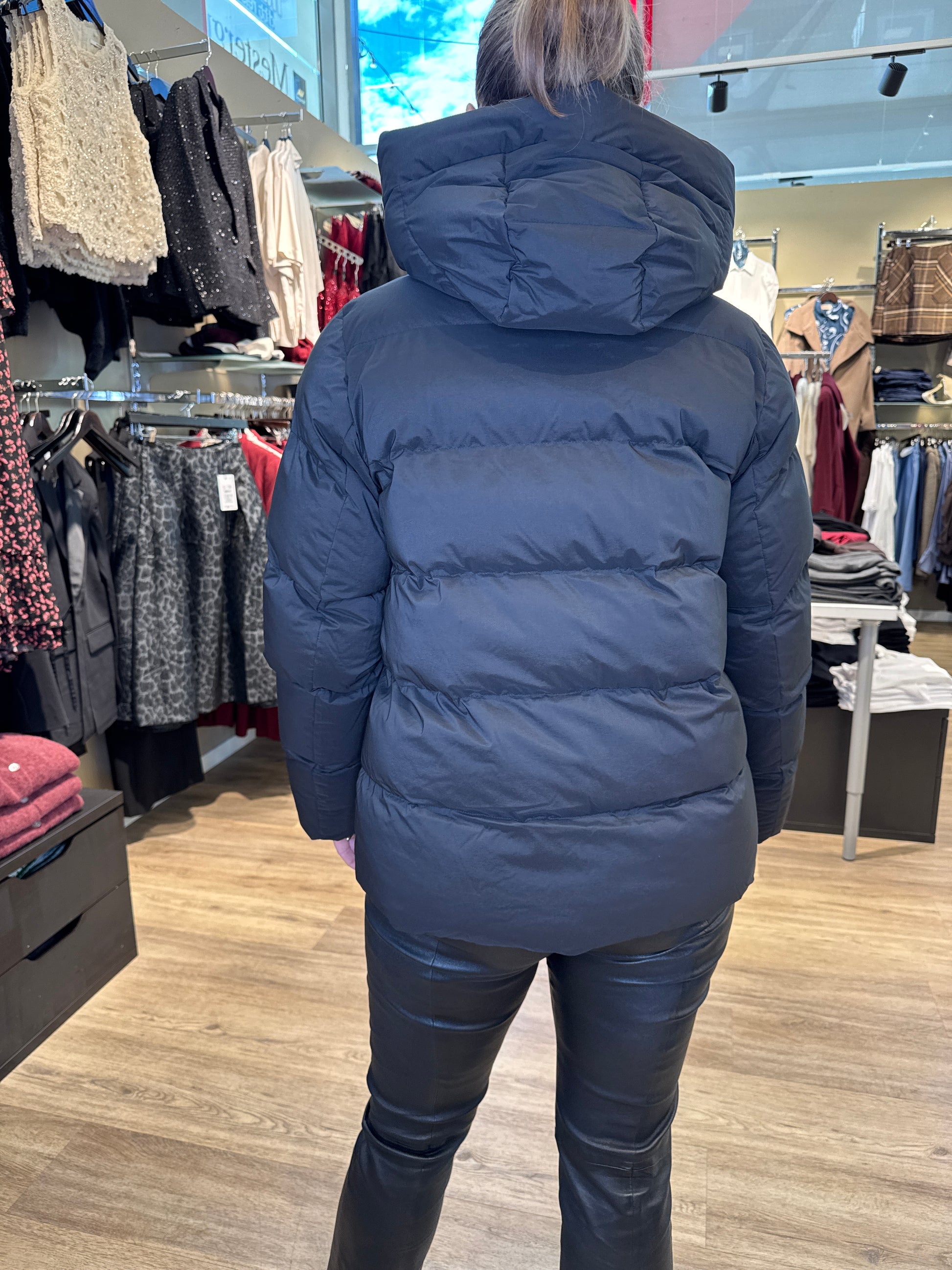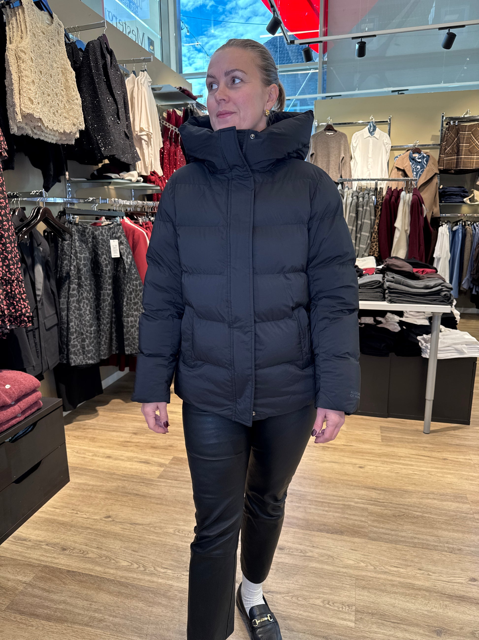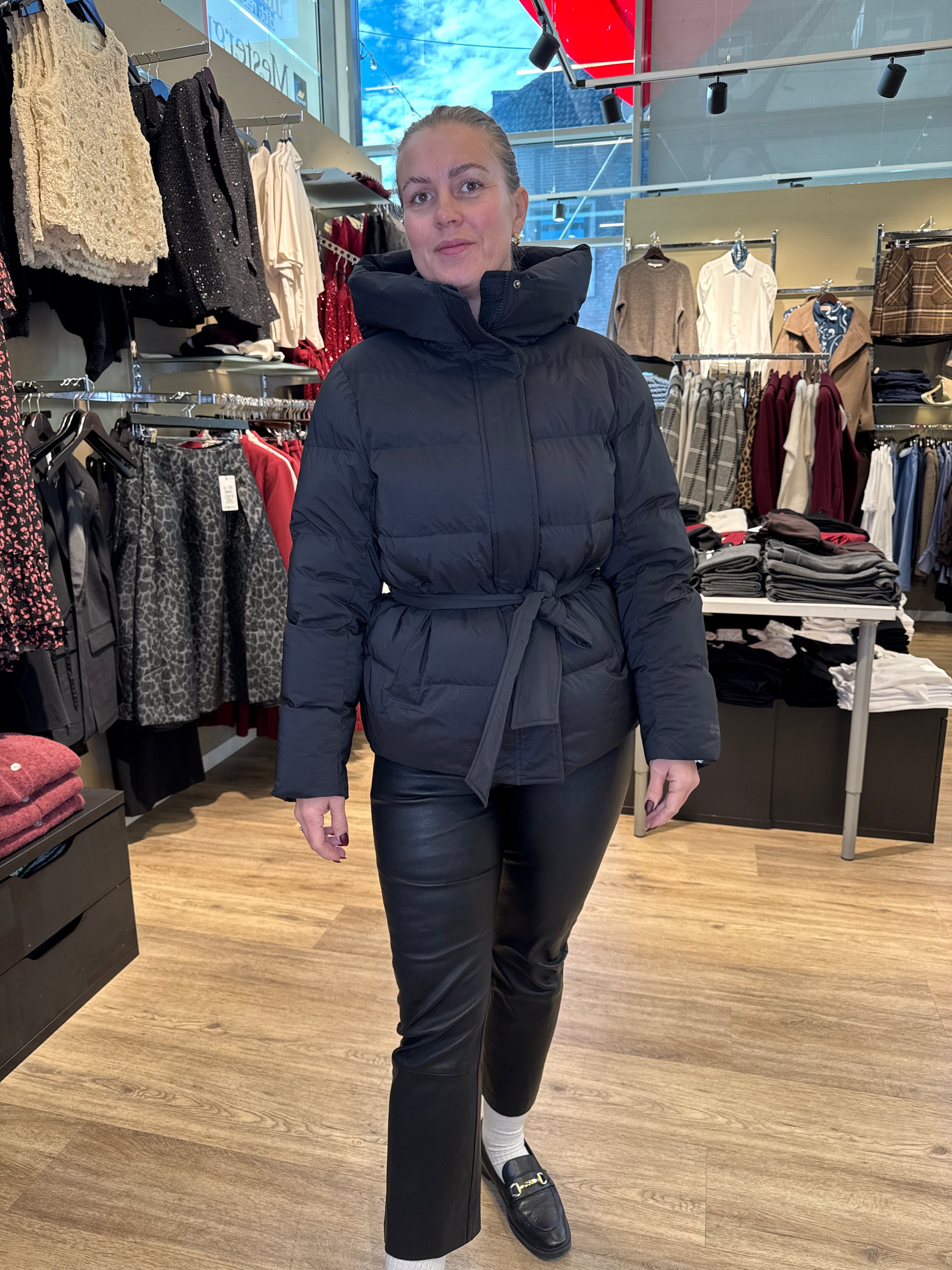 Kort rå sort boblejakke med sorona dun som er vegansk. Denne er varm og god samtidig som den er vanntett vindtett og puster. Søring på innsiden i hetta. Denne er chunky og fin. Snøstopper i ermene og med refleks. Knapp på lommene. Kommer med belte du kan bruke for mer feminin fasong.