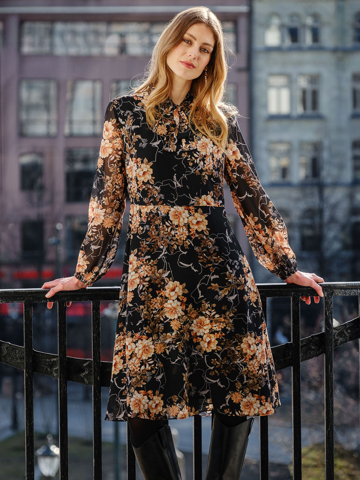Nydelig høst kjole fra norske Ane Mone. Sort bakgrunn med brune blomster print med fine detaljer. Kjolen er veldig fin med innsvingt liv og lange ermer. DU kan ha sløyfen knytt eller åpen. Modellen er innsvingt så man får en feminin fasong. Glidelås i siden. Kjolen er foret.
