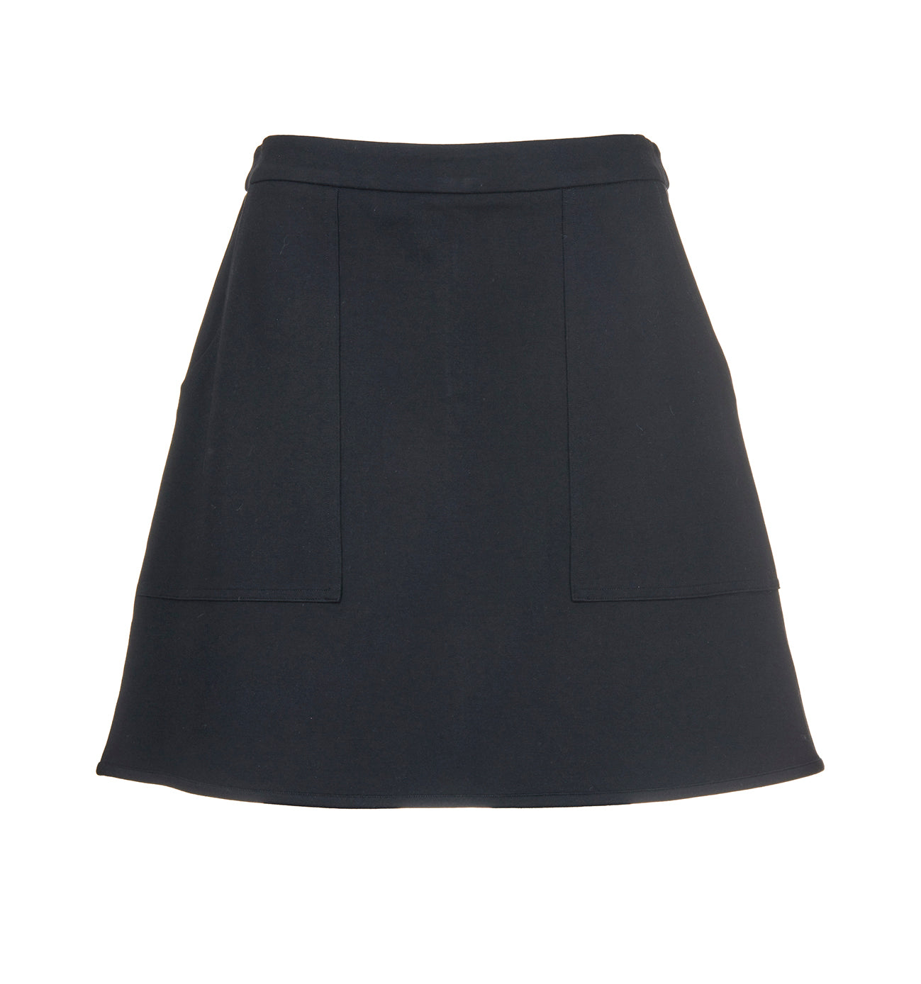 Enkelt sort a-fasong skjørt med litt hold i. SKjørtet har glidelås bak og påsydde lommer foran. Superfint både med og uten strømpebukse under.