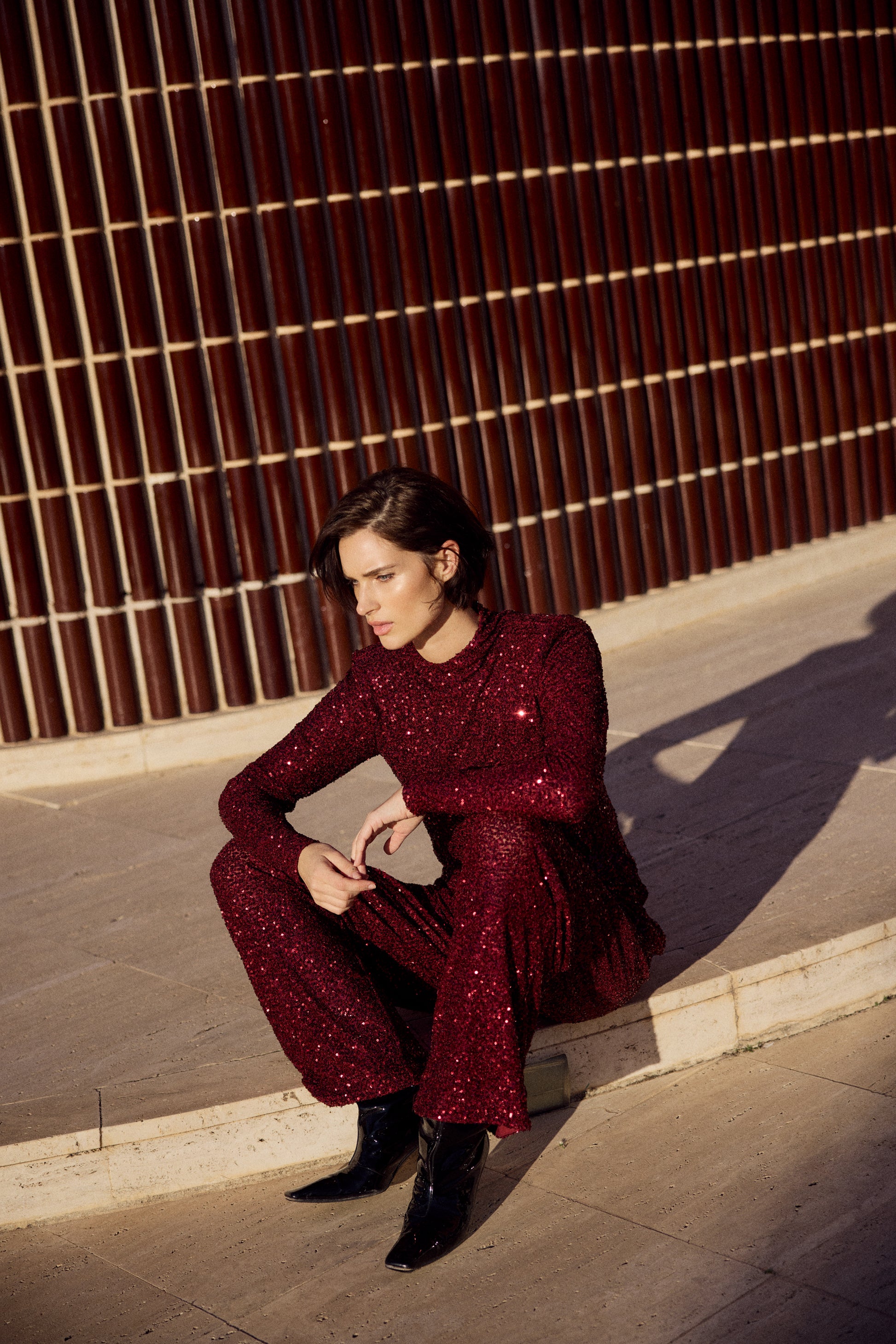 Den perfekte jule røde paljett toppen med rund hals, glidelås bak og puffet fylte skuldre. Denne er stretchy og deilig å ha på. Foret på innsiden så man bli ikke klam. Perfekt til buksa Maya Trouser.