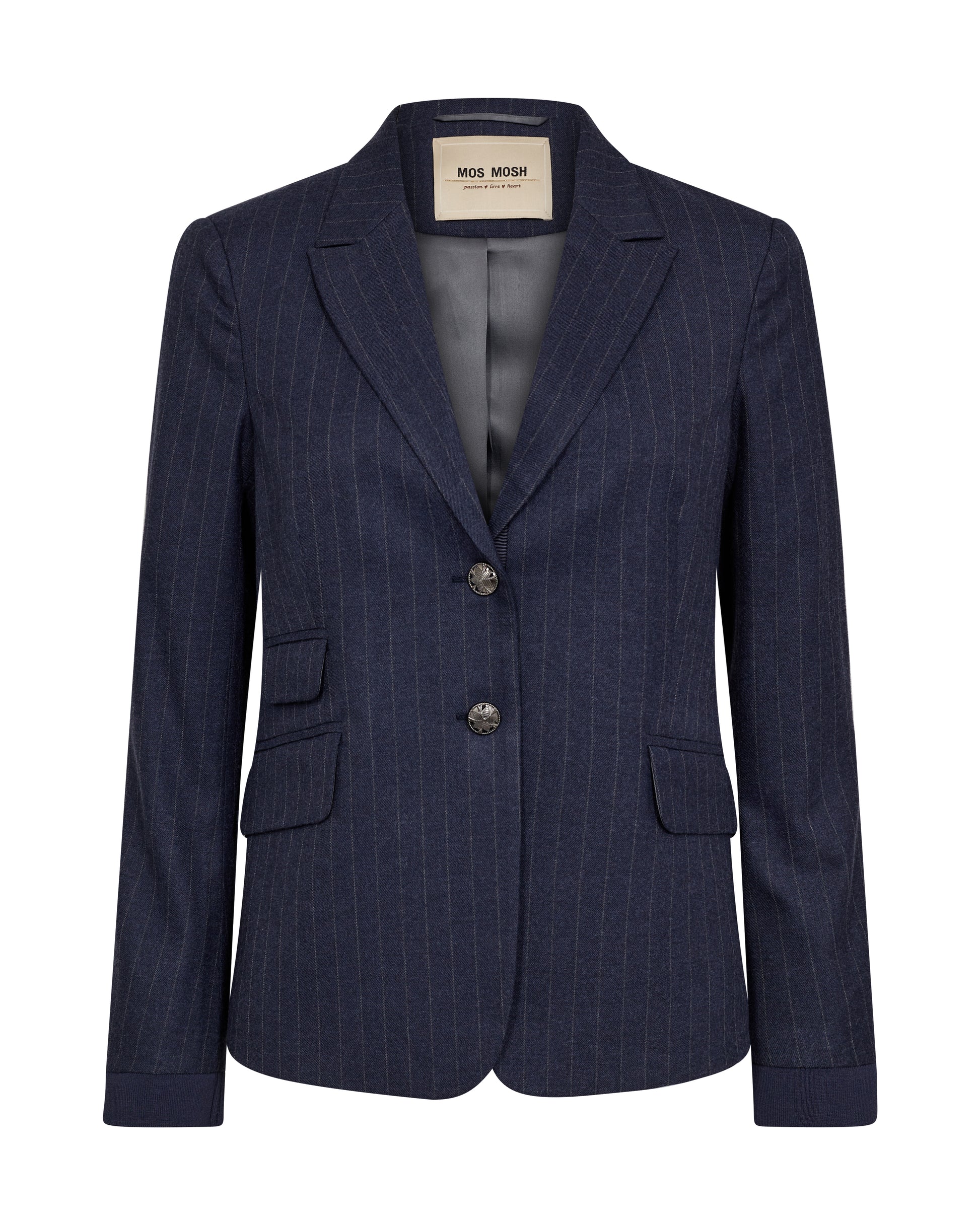 Deilig ny blazer i blå med pin stripe. Strikk på ermene som gjr den røff. To knappe ri sølv. Perfekt alene eller sammen over buksa Ellen Carie. Føles litt børstet ut i overflaten. Normal størrelse.