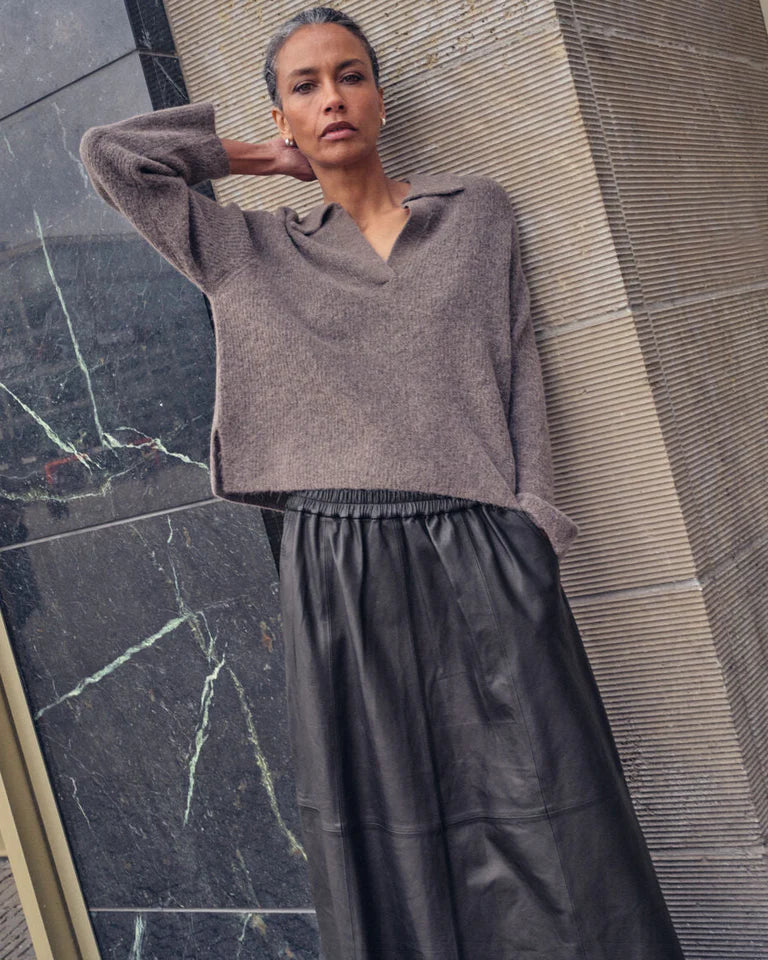 Thora er tilbake i en ny variant. Denne angen med polo krage. Fargen er falcon er brun melert farge, V-hals med krage og vanlig erm. Denne er stor på størrelsen så anbefaler å gå ned en.
